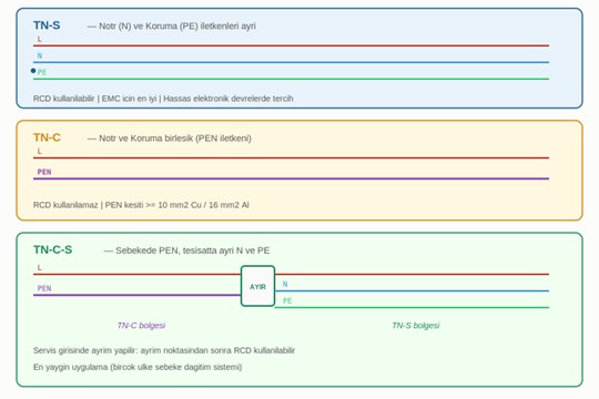 TN-S: N ve PE ayrı. RCD uyumlu. EMC için en iyi. Hassas elektronik devrelerde tercih edilir.