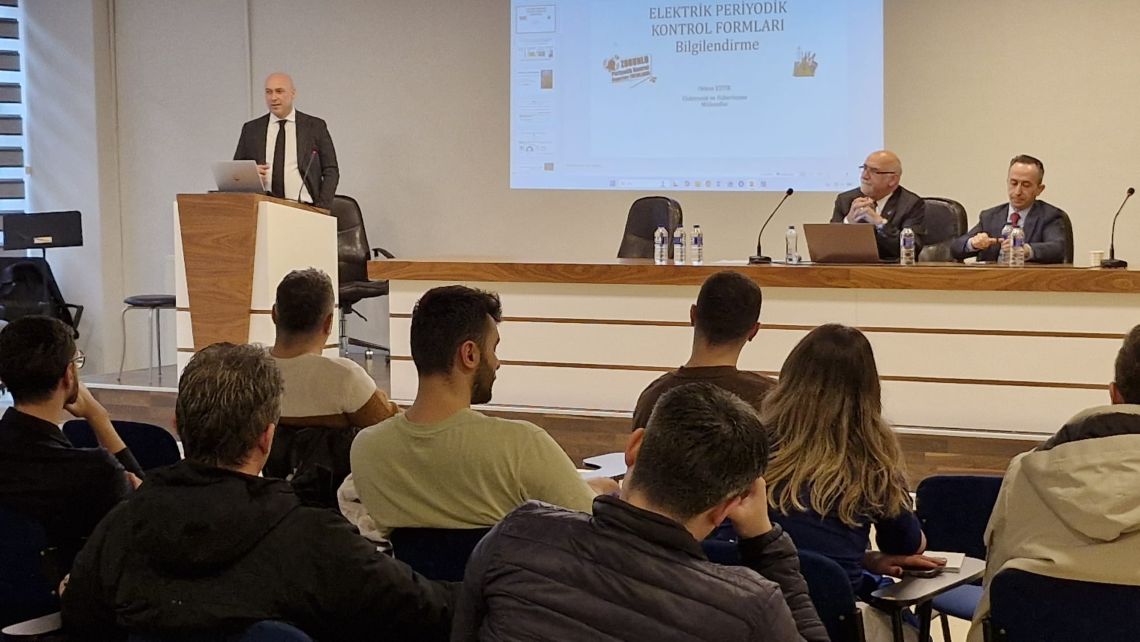 Risk Yönetim Derneği Bursa Çalışma Komitesi’nin Bursa Tabipler Odası’nda düzenlemiş olduğu Elektrik Tesisatı Periyodik Kontrollerinde Yeni Yaklaşımlar adlı seminerde, T. C. Çalışma ve Sosyal Güvenlik Bakanlığı İş Teftiş Kurulu Bursa Grup Başkanlığı İş Baş Müfettişi Elektrik Mühendisi Sayın Ali Başyiğit ile birlikte Elektrik Mühendisleri Derneği Yönetim Kurulu Üyesi Elektronik ve Haberleşme Mühendisi Sayın Orkun Estik’in yapmış olduğu sunumlar ile Bursa’da meslektaşların ve İş Sağlığı ve Güvenliği Uzmanları’nın bakanlığın çıkarmış olduğu yeni periyodik kontrol formları hakkında bilgilendirmeler yapıldı.